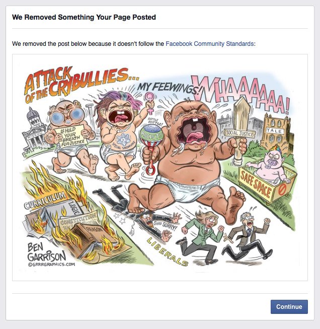 PC CENSORSHIP FACEBOOK has removed "CryBullies"from my FB pages saying it "violates" their "Community Standards!"pic.twitter.com/QjxhA3V3yE