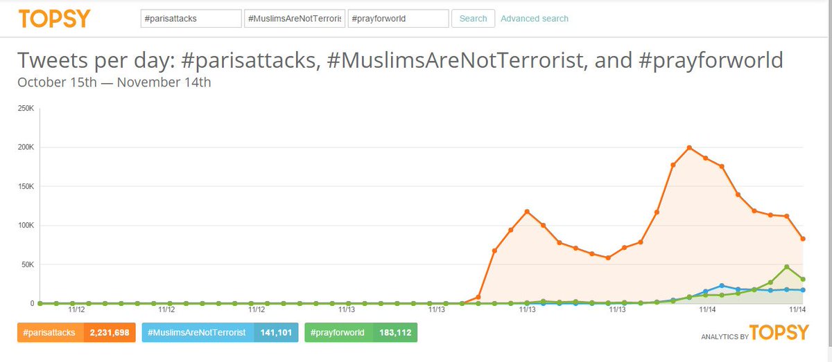 If you look at my trends now, Paris attacks are nowhere, and #MuslimsAreNotTerrorist is number 3. What are people going to think about USA?