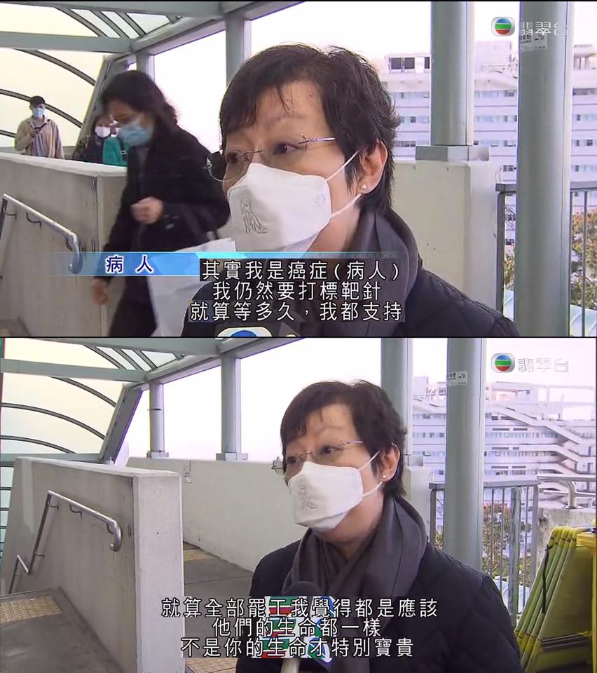 #HongKong) "I hv cancer. I still need my targeted therapy shots. (But) I will support them) no matter how long I hv to wait. Even they all go on strike, I think it's ok. Their lives are just as valuable as ours"#coronaviruspic.twitter.com/WINwcZ7hN6