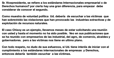 El extractivismo en su gran mayoría en Guatemala va contra de los DDHH. El "compromiso" son actividades de corta duración para ganarse a la gente, pero tal como la bananera, el café u otros se promocionan con la idea de desarrollo y al final es una farsa. Desarrollo para quien?.