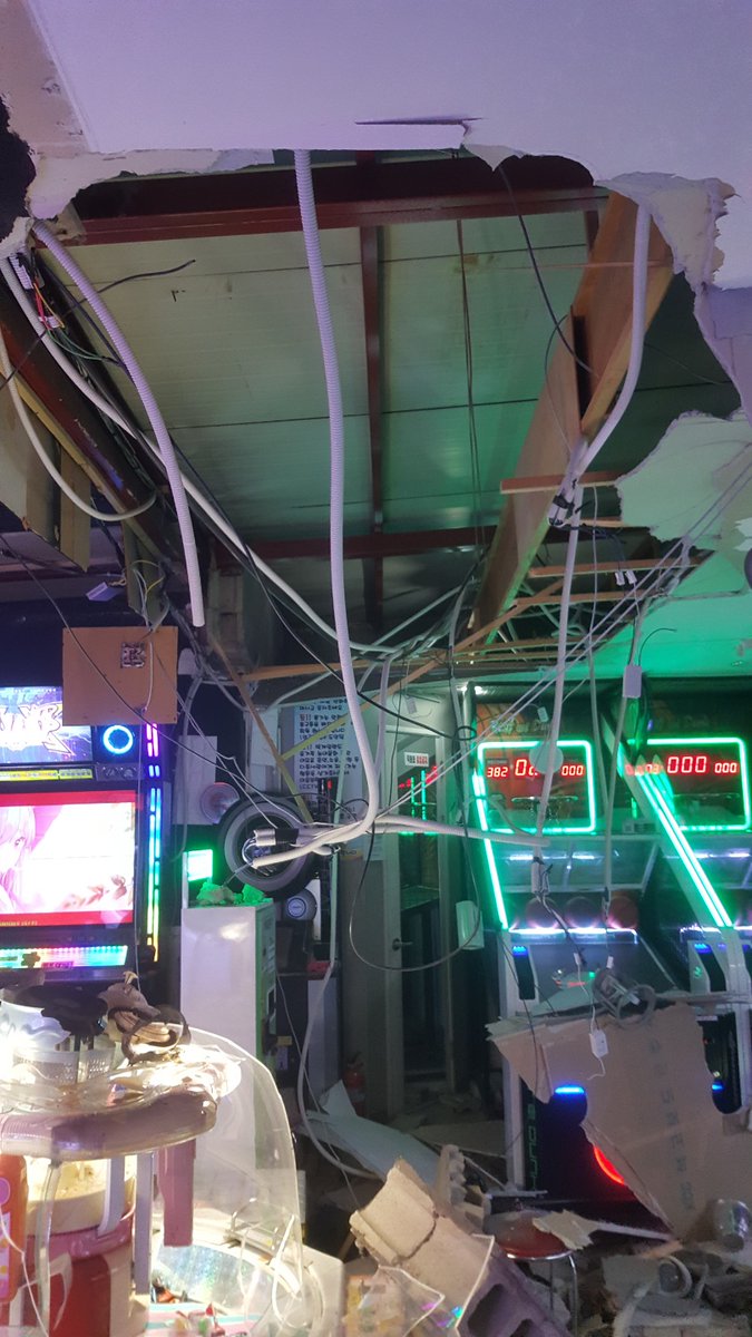 현재 리듬게임존으로 가는 길목에 천장이 무너져 내렸습니다. 다친 사람은 없는 상태이며, 후속 조치가 들어오는대로 알려드리도록 하겠습니다. 이용에 참고 부탁드립니다.pic.twitter.com/EOE3FlwpLf