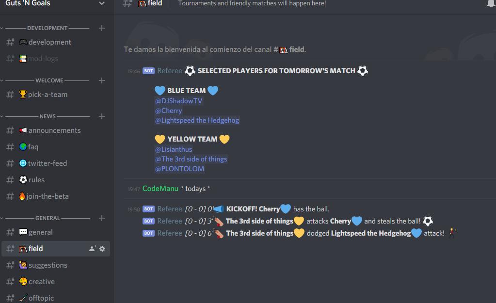 @discordapp channel we are running a weekly tournament, we are doing a friendly match at the moment. Spent some time working on this bot and I think it's pretty cool! https://discord.gg/MGY47dE#gamedev#indiedevpic.twitter.com/Th5uQilM9M