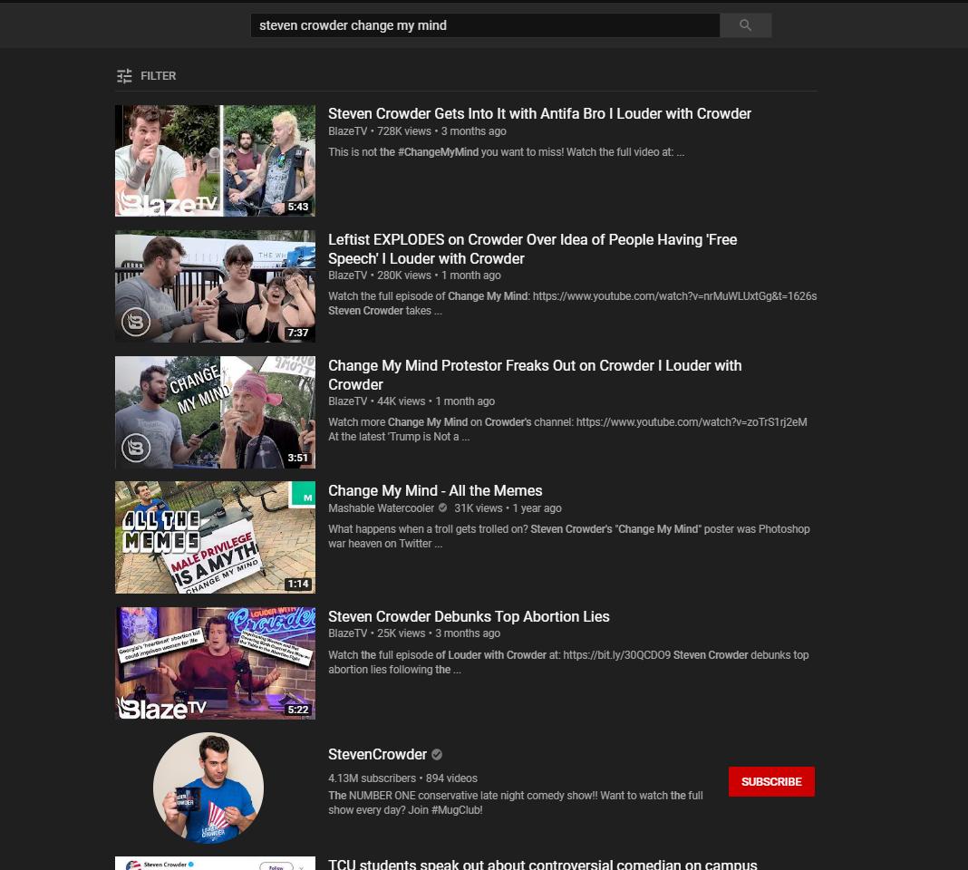 Yeah. Except for the dedicated channel bar at the right of the first picture, none of the videos are from the channel StephenCrowder. As in, no StephenCrowder videos are in the SEARCH RESULTS when you look for "stephen crowder". Isn't that being COMPLETELY blacklisted?