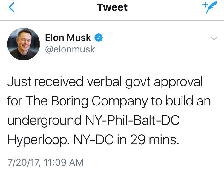 Just received verbal govt approval for The Boring Company to build an underground NY-Phil-Balt-DC Hyperloop. NY-DC in 29 mins.