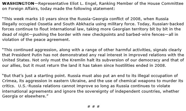 RM @RepEliotEngel's statement on the 10th anniversary of the Georgia-Russia War: https://democrats-foreignaffairs.house.gov/news/press-releases/engel-statement-10th-anniversary-georgia-russia-war …pic.twitter.com/1gUdj9Sq3V