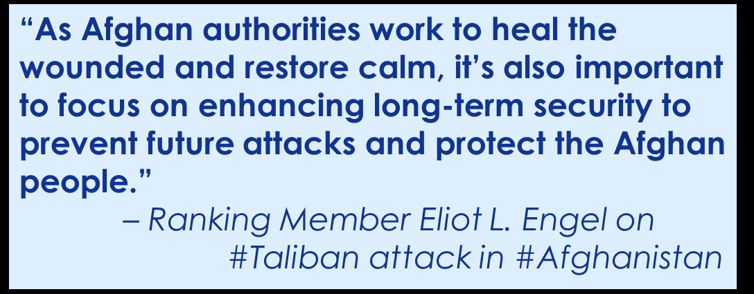 RM @RepEliotEngel Statement on #Taliban Attack in #Afghanistan http://1.usa.gov/1peFv2O  #KabulBlast #KabulAttackpic.twitter.com/QkulbwILpE
