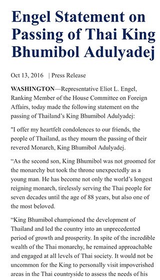 RM @RepEliotEngel statement on passing of #ThaiKing #BhumibolAdulyadej https://democrats-foreignaffairs.house.gov/news/press-releases/engel-statement-passing-thai-king-bhumibol-adulyadej …pic.twitter.com/hxClQlIfTe