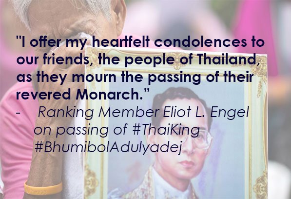 RM @RepEliotEngel statement on passing of #ThaiKing #BhumibolAdulyadej https://democrats-foreignaffairs.house.gov/news/press-releases/engel-statement-passing-thai-king-bhumibol-adulyadej …pic.twitter.com/z4UwyU6LgB