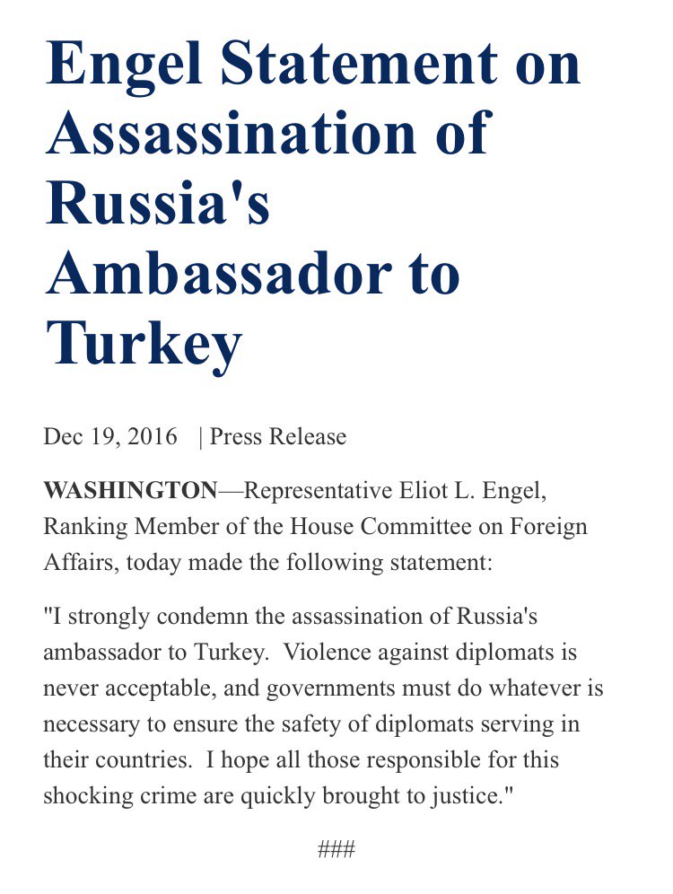 RM @RepEliotEngel Statement on Assassination of #Russia’s Ambassador to #Turkey https://democrats-foreignaffairs.house.gov/news/press-releases/engel-statement-assassination-russias-ambassador-turkey …pic.twitter.com/vwbzRUI0WK
