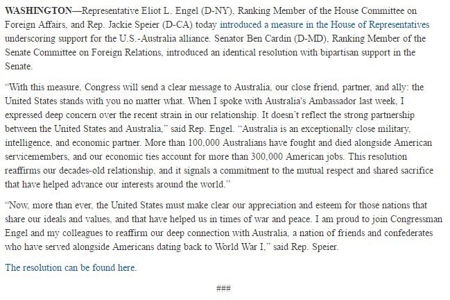 RM @RepEliotEngel & @RepSpeier offer resolution reaffirming U.S. alliance with #Australia https://democrats-foreignaffairs.house.gov/news/press-releases/engel-speier-offer-measure-reaffirming-us-australia-alliance …pic.twitter.com/WO9QY6zYBY