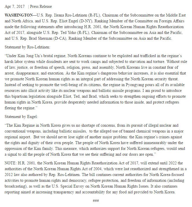 .@RepEliotEngel @RosLehtinen @RepTedYoho @BradSherman introduce #NorthKorea Human Rights Reauthorization Act: https://democrats-foreignaffairs.house.gov/news/press-releases/ros-lehtinen-engel-yoho-and-sherman-introduce-north-korea-human-rights …pic.twitter.com/Fcq3NSrekh