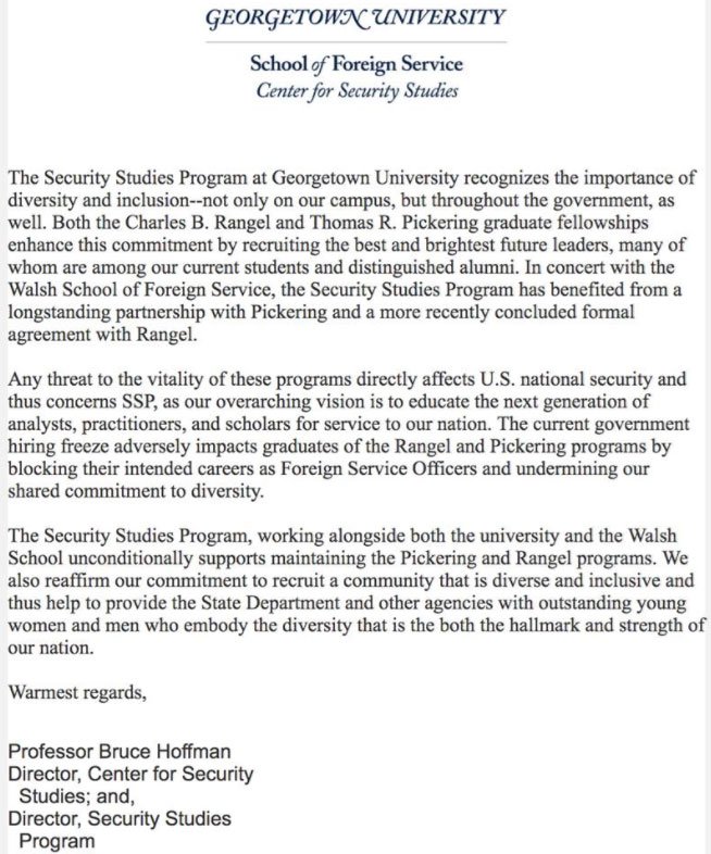 .@RepEliotEngel: Agree w/@GeorgetownCSS @hoffman_bruce. @StateDept #Rangel & #Pickering fellows are among our best & brightest #TrumpCutspic.twitter.com/V4Htdr2POY