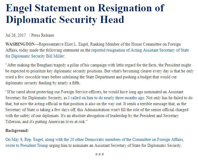 Vacant diplomatic security post is abrogation of leadership by POTUS & Sec Tillerson. via @joshrogin @washingtonpost https://www.washingtonpost.com/news/josh-rogin/wp/2017/07/26/state-department-head-of-diplomatic-security-resigns/?utm_term=.43e72349d355 …
