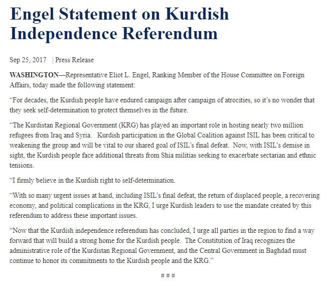 RM @RepEliotEngel statement on #kurdishindependence #Referendum https://democrats-foreignaffairs.house.gov/news/press-releases/engel-statement-kurdish-independence-referendum … #KurdistanReferendumpic.twitter.com/u20jhkpnh2