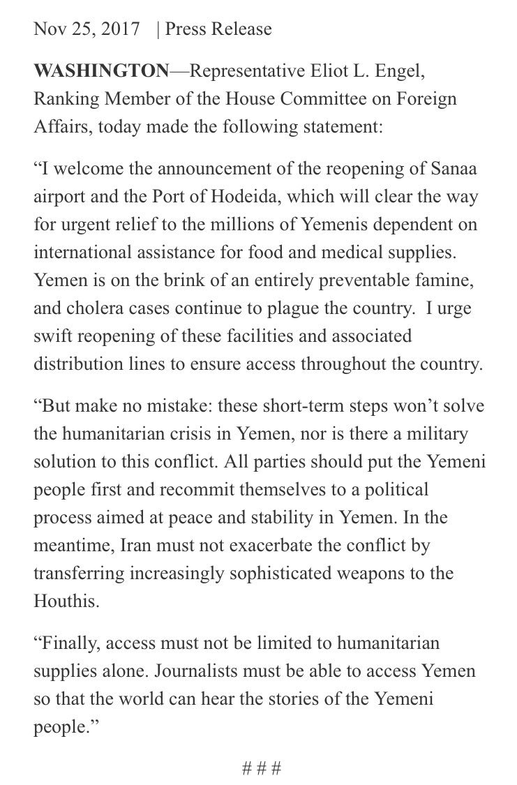 RM @RepEliotEngel statement on reopening of airport & port in #Yemen: https://democrats-foreignaffairs.house.gov/news/press-releases/engel-statement-reopening-yemen-airport-and-port …pic.twitter.com/PpTgLxrhqn