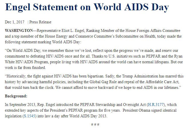 .@RepEliotEngel statement on #WorldAIDSDay2017: https://democrats-foreignaffairs.house.gov/news/press-releases/engel-statement-world-aids-day-0 … #endaids2030 #WAD2017pic.twitter.com/PiZ9QAll6C