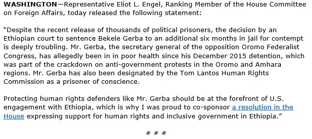 #Ethiopia’s crackdown on human rights defender #BekeleGerba is deeply troubling. Read RM @RepEliotEngel's statement: https://democrats-foreignaffairs.house.gov/news/press-releases/engel-statement-ethiopian-court-sentencing-bekele-gerba …pic.twitter.com/tQmTyENg3c