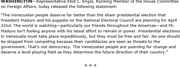 RM @RepEliotEngel's statement on #Venezuela presidential election: https://democrats-foreignaffairs.house.gov/news/press-releases/engel-statement-venezuala-presidential-election …pic.twitter.com/XAyRDruPVZ