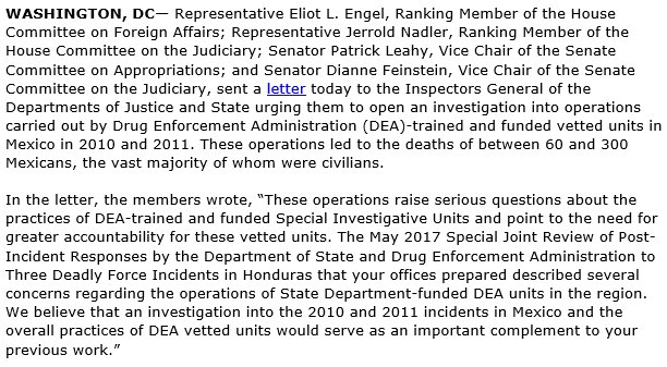 RM @RepEliotEngel, @JerryNadler, @SenatorLeahy, and @SenFeinstein called for Inspectors General investigation of DEA role in Mexico operations: https://democrats-foreignaffairs.house.gov/news/press-releases/engel-nadler-leahy-feinstein-call-inspectors-general-investigation-dea-role …pic.twitter.com/LwfodrQBcC