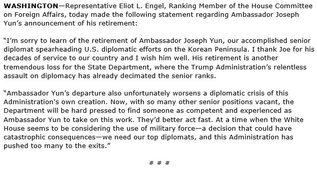RM @RepEliotEngel's statement on Ambassador Joseph Yun's retirement: https://democrats-foreignaffairs.house.gov/news/press-releases/engel-statement-ambassador-yuns-retirement … #NorthKoreapic.twitter.com/PuyWzWv624