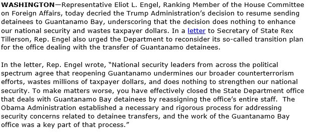 RM @RepEliotEngel decried the Trump administration's Guantanamo Bay decisions: https://democrats-foreignaffairs.house.gov/news/press-releases/engel-decries-trump-administration-guantanamo-bay-decision …pic.twitter.com/9xCoegSCLb