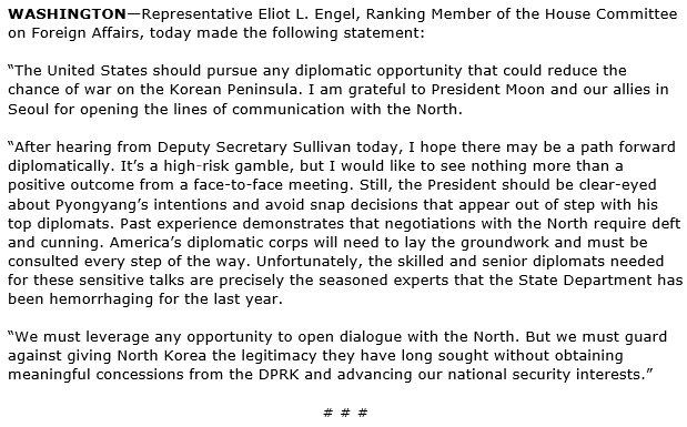 RM @RepEliotEngel's statement on #NorthKorea talks: https://democrats-foreignaffairs.house.gov/news/press-releases/engel-statement-north-korea-talks …pic.twitter.com/5t1Y2j4BcI
