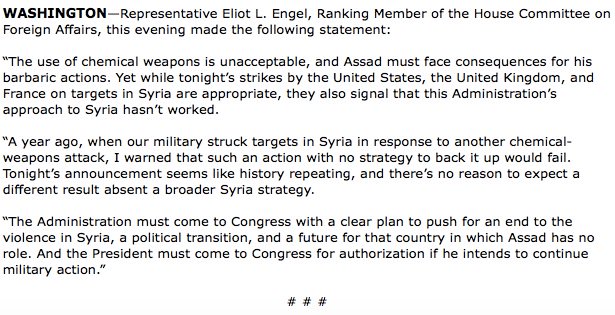 Thanks, Congressman, for speaking up for a political (non-military) solution in #Syria. Congress has the right to decide matters of war and peace. We vehemently condemn unauthorized war. War, like climate change, hurts poor people first and worst.