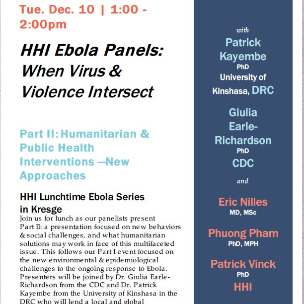 @HarvardChanSPH for "HHI Ebola Panels: When Virus & Violence Intersect" featuring:@HHI's@drph2,@developmentdata, Dr. Eric Nilles; the@CDCgov's Dr. Giulia Earle-Richardson and Dr. Patrick Kayembe from the DRC. See you there!pic.twitter.com/TEQG6MbUfQ