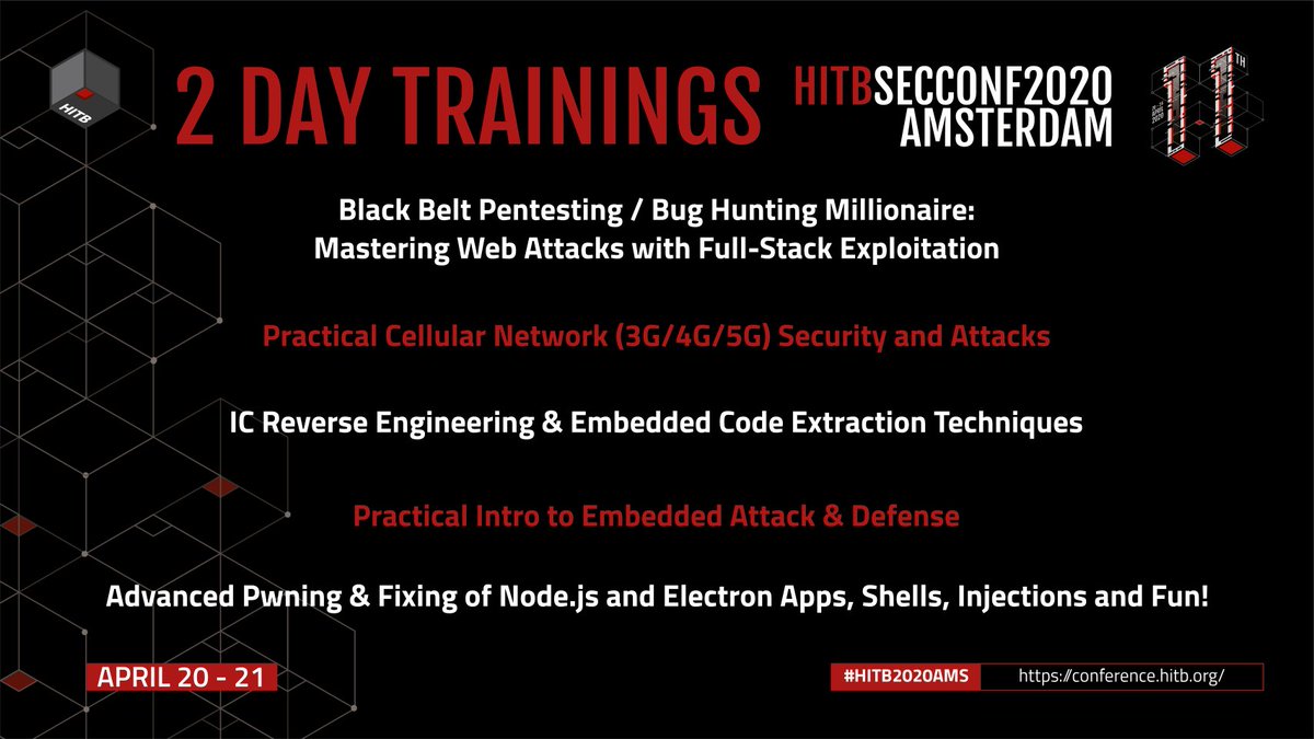 #HITB2020AMS - with courses on everything from cell network security and IoT technologies to malware analysis and binary exploitation, there's sure to be something to interest you https://conference.hitb.org/hitbsecconf2020ams/training/ …pic.twitter.com/QayE1cD0HC