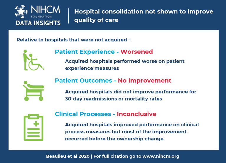 A study of ~250 hospitals acquired between 2009-2013 found no evidence that the ownership change improved their quality of care. Check out our Research Insights for highlights of the study by N. Beaulieu