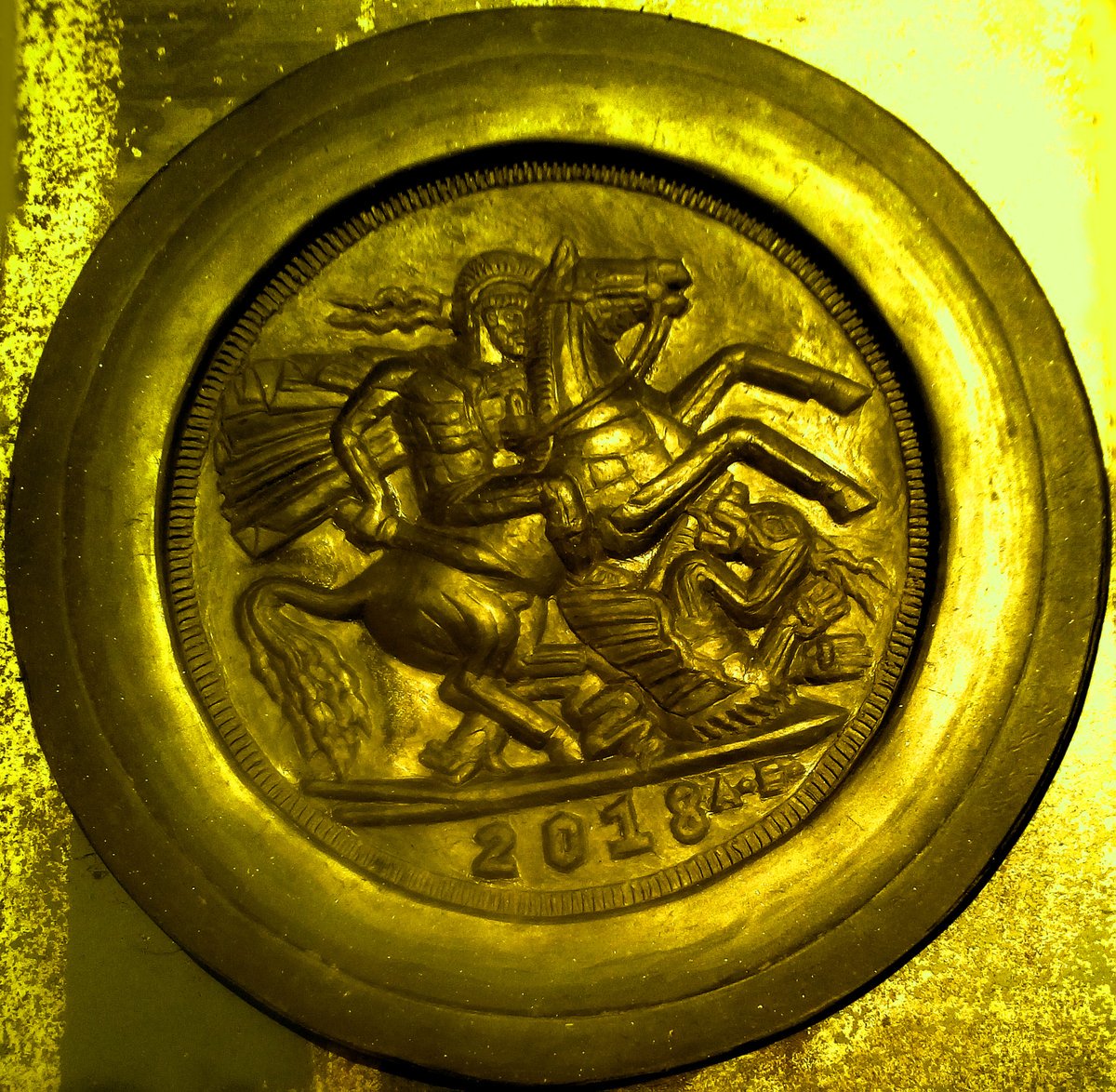The Royal Mint @RoyalMintUK St George Commemoration Memorial Pound coin & medal illustrator(tail side)Blank disc die figure Equestrian Horse killing Dragon.Planchet Designed,Modeled & Engraved By UK & Canadian MFA ,MPHILFA & Professor Chief Engraver Sculptor Amraphael Estiphanospic.twitter.com/x3GlPFjqMV