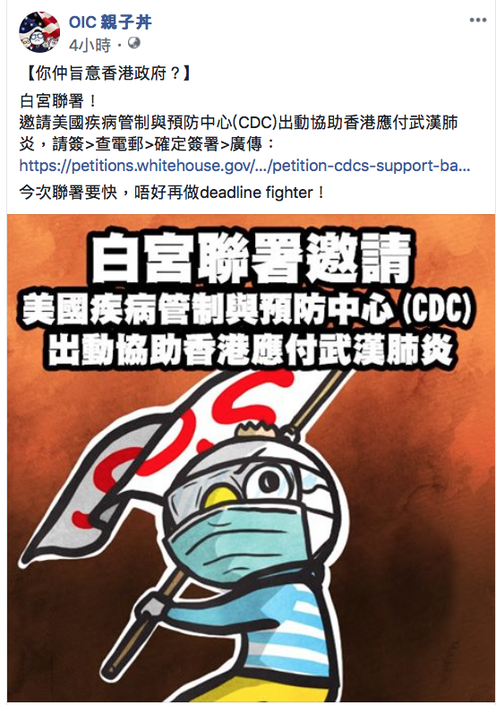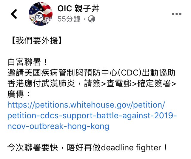 [簽+ RT] 不要讓香港醫護孤單面對。 邀請美國疾病管制與預防中心(CDC)出動幫香港應付武漢肺炎的白宮聯署做好了,請廣傳和幫忙簽署: https://petitions.whitehouse.gov/petition/petition-cdcs-support-battle-against-2019-ncov-outbreak-hong-kong …