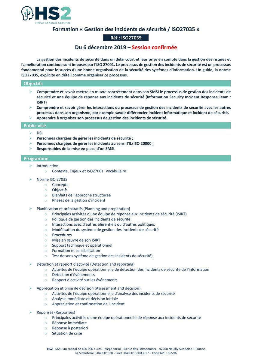 @HS2formation "ISO27035 - Gestion des incidents de sécurité" dispensée par Herve Schauer et Yuksel Aydin le 6 décembre prochain à Paris.#ISO27035#cybersécurité#PDCA#risk Renseignement / Inscription :