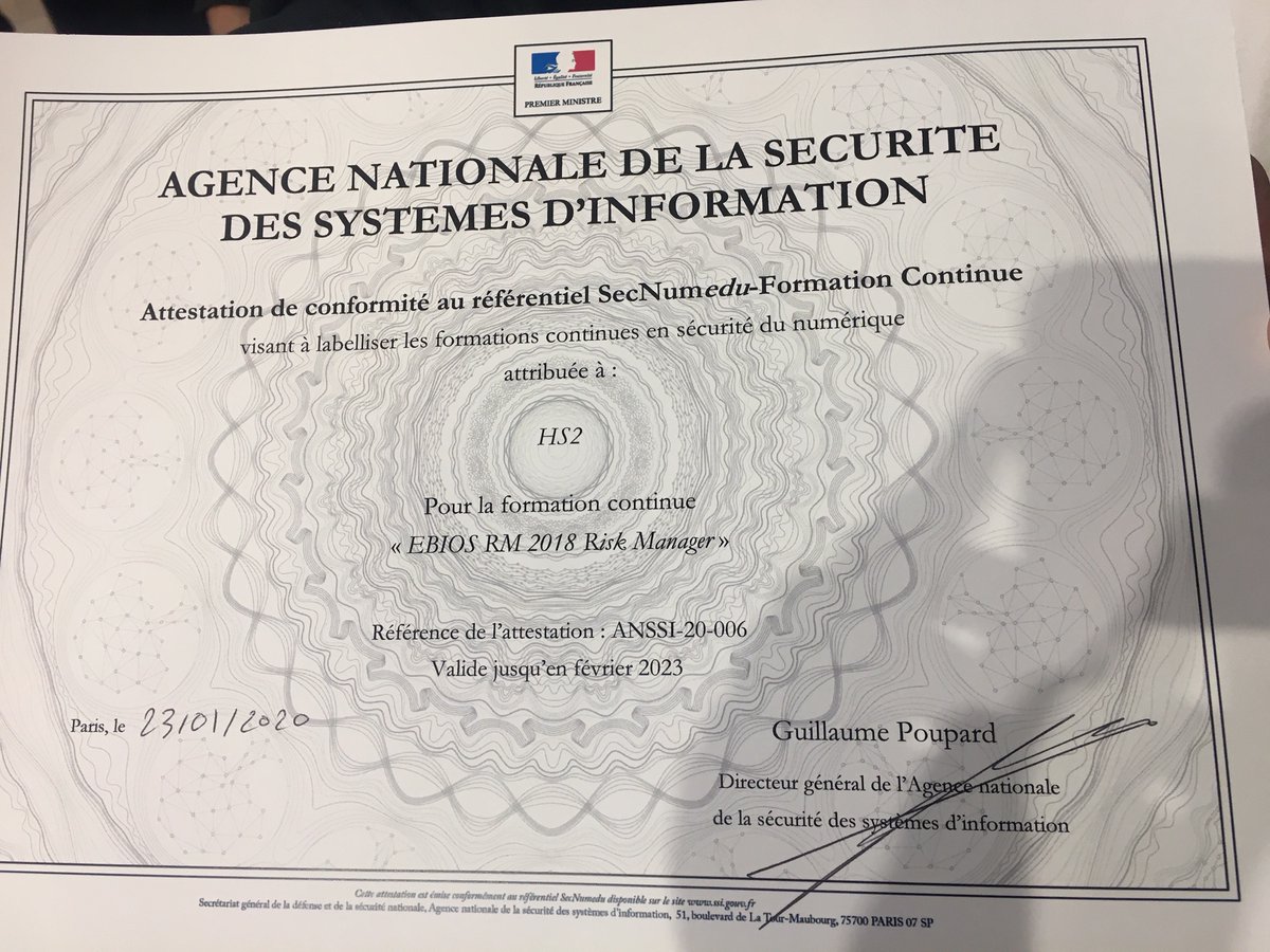 #FIC2020@HS2formation est fier d'avoir reçu le label#SecNumEdu -FC de la part d'Emmanuel Germain directeur-adjoint de@ANSSI_FR pour notre formation#EBIOSRM 2018 https://www.hs2.fr/ebios2018-ebios-2018-risk-manager/ …