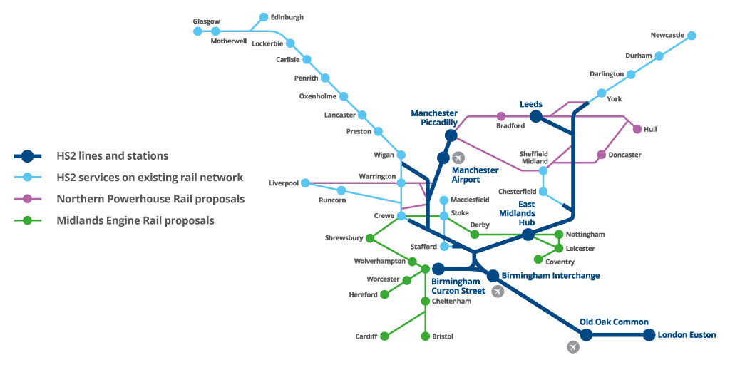 #HS2 trains will travel on their own dedicated track then onward onto the existing rail network to serve over 25 places across the country. The#North and#Midlands recognise HS2 as essential for delivering#NorthernPowerhouseRail and#MidlandsEngineRail.pic.twitter.com/ke1NGn516c