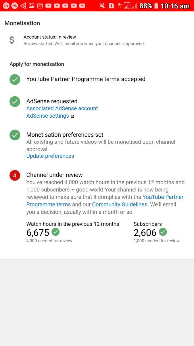@TeamYouTube Dear Team YouTube I have already completed 4k hour And 1k Subscriber in previous 365 Days and my channel is under review till One month .but monetization is not enable . please guide us.... https://www.youtube.com/channel/UC8XpjxkWEI2Ttq5NX5gOROA … pic.twitter.com/GSG3eTeCi4pic.twitter.com/mdmnYpVlPQ