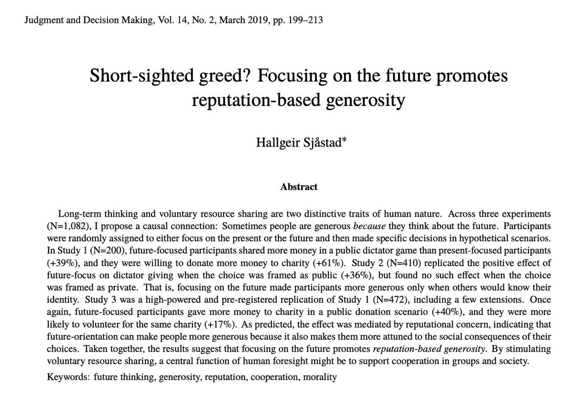 "Short-sighted greed? Focusing on the future promotes reputation-based generosity." My new paper in JDM: http://journal.sjdm.org/17/17907b/jdm17907b.pdf ….pic.twitter.com/a3JaPWYKod