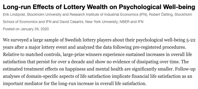 Interesting paper from economics just published, finding a strong effect of lottery wealth on life satisfaction 10+ years later, but no significant long-term effect on happiness. http://www.restud.com/wp-content/uploads/2020/01/MS26224manuscript.pdf …pic.twitter.com/bwgxmvg42p