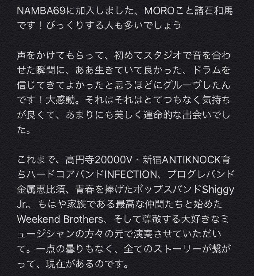 突然ですが、報告です NAMBA69に加入しました! MOROこと諸石和馬です 140字じゃ伝わらないから気持ちを文章に込めました これからよろしくお願いします!!pic.twitter.com/JAsx0J9UAo