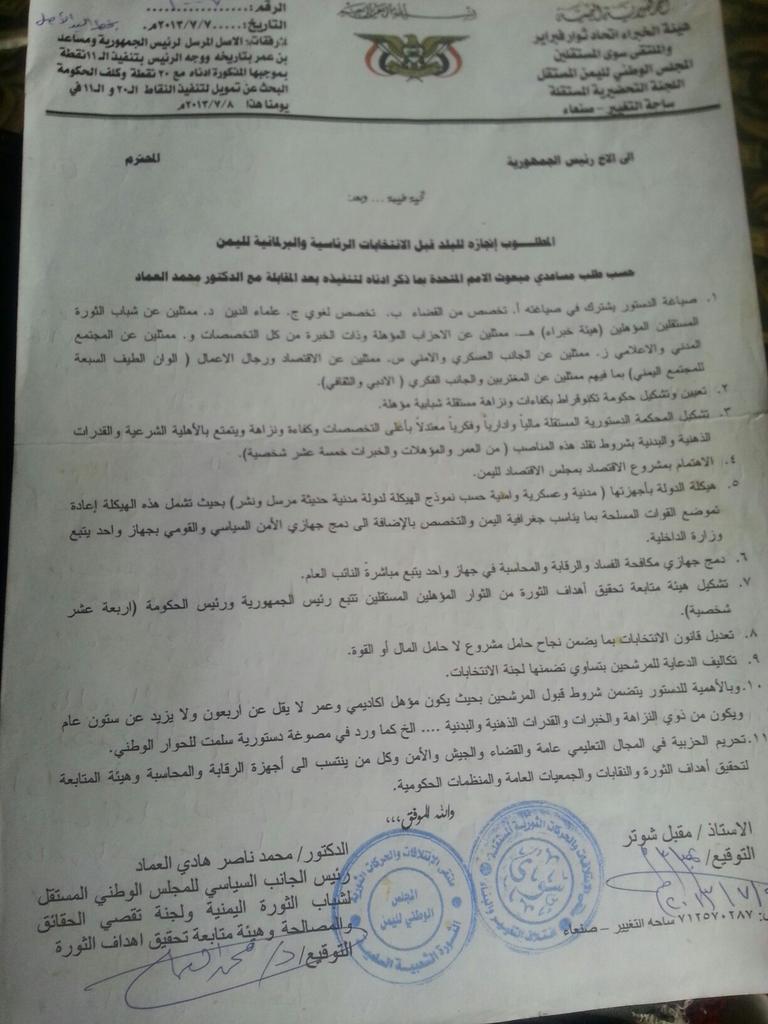 خارطةالطريق للحل السياسي للمجلس الوطني لليمن بمشروع ثورة11فبراير البرفبسورالعقيد العمادpic.twitter.com/6VYsmLIB53