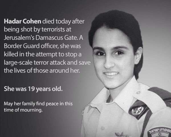 4 years ago, 19-year-old policewoman, Hadar Cohen was murdered as she fought off 3 Palestinian terrorists equipped with guns, knives, and pipe bombs in a terror attack in Jerusalem. Her heroic actions saved lives. Today we remember. May her memory forever be a blessing.pic.twitter.com/WyFWgzymcG