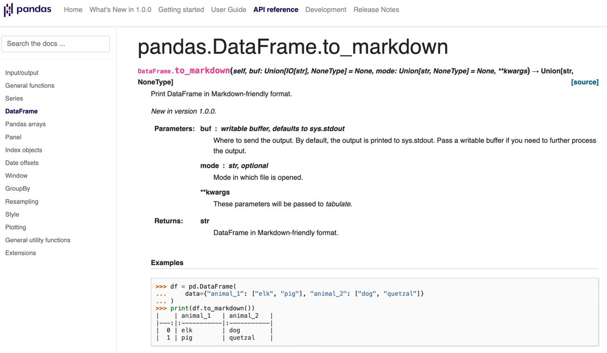 to the team @pandas_dev, keep up the great work. https://pandas.pydata.org/pandas-docs/stable/reference/api/pandas.DataFrame.to_markdown.html …pic.twitter.com/3GM0Iw7GMW