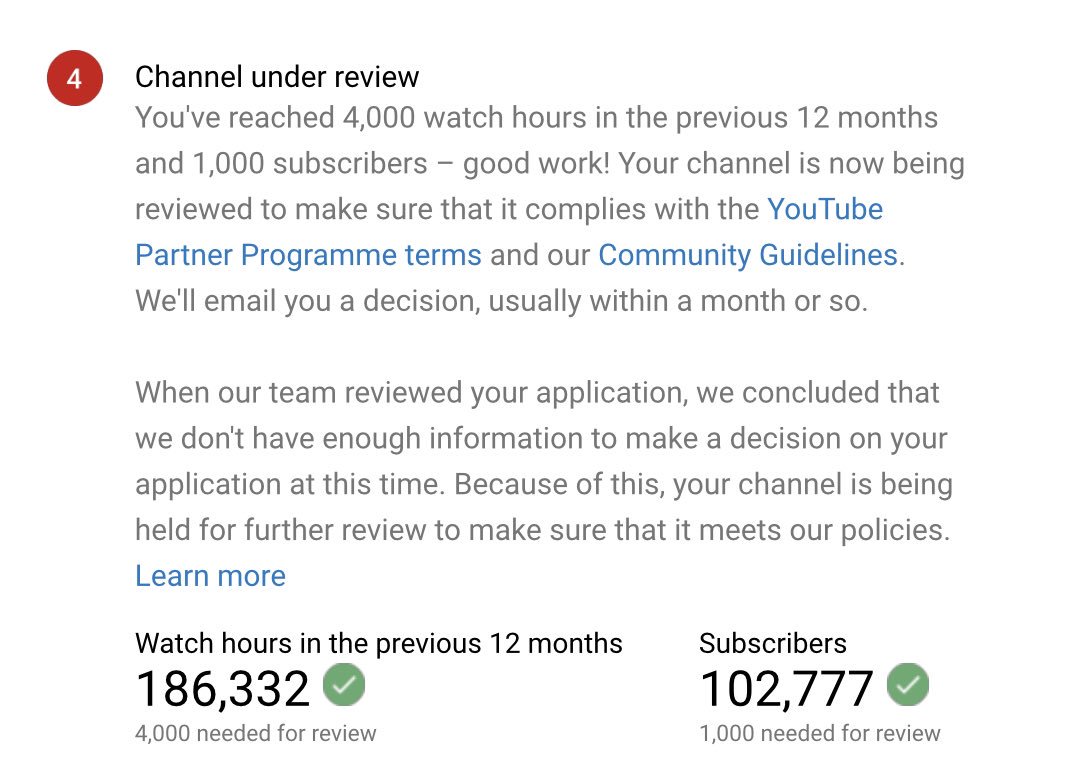 @TeamYouTube dear Team YouTube, I have already reached 4,000 watch hours and 1,000 subscribers in the last 12 months and my channel is still under review until now, but monetisation is not enabled. Please guide me as soon as possible. Link to my channel: https://www.youtube.com/channel/UCAcNpFxHAhfSGbkiKeWPz_Q …pic.twitter.com/2i21TKdvft