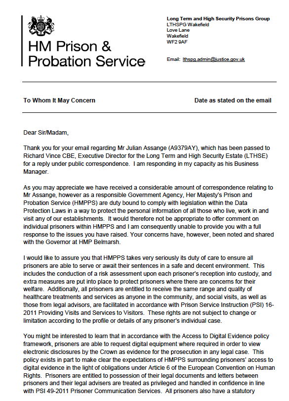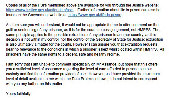 I received a very similar response from the Home Office when expressing concern of JA's treatment & health. very disingenuous & patronising when considering the facts of
