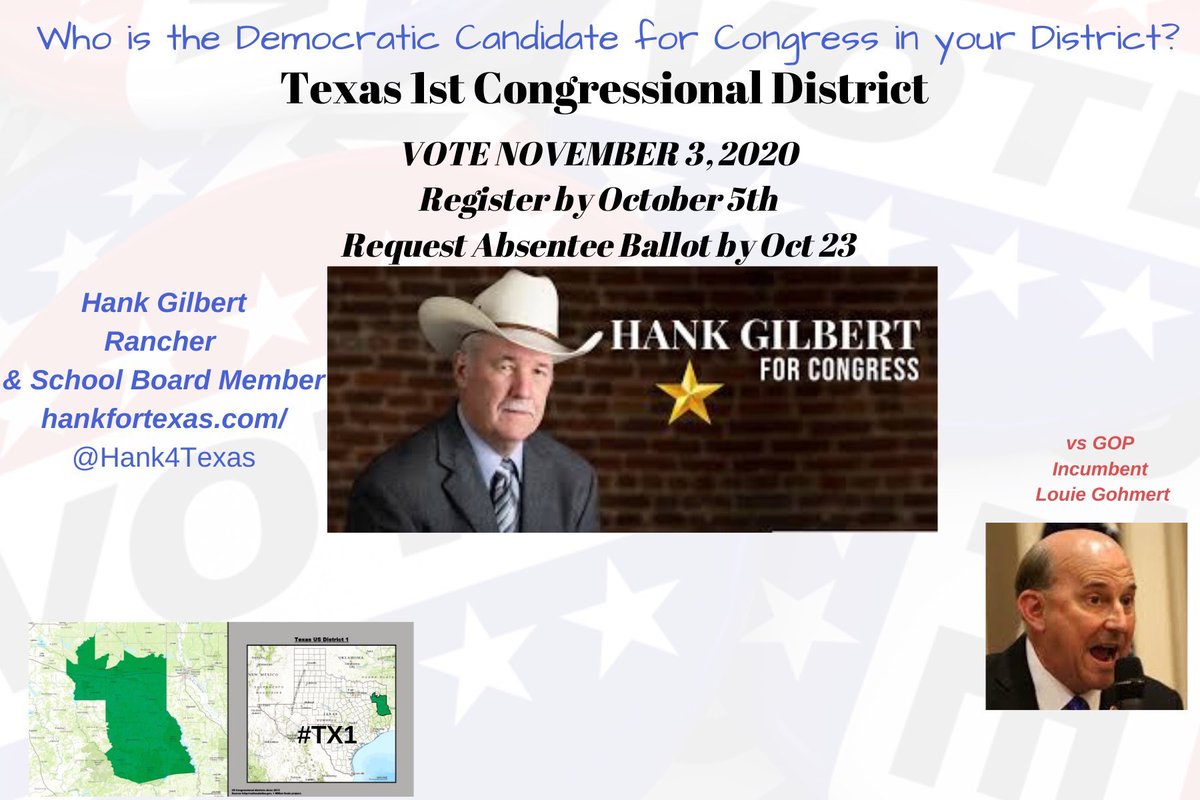 #TX1 Texas 1st Congressional District HANK GILBERT http://www.hankfortexas.com/ Donate here: https://secure.actblue.com/donate/hank-gilbert-for-congress-1 …@Hank4Texas#Congress2020#NoSafeSeats THREAD from https://www.postcardsforamerica.com/all-democratic-candidates-by-state.html …pic.twitter.com/mG6ufsttmg