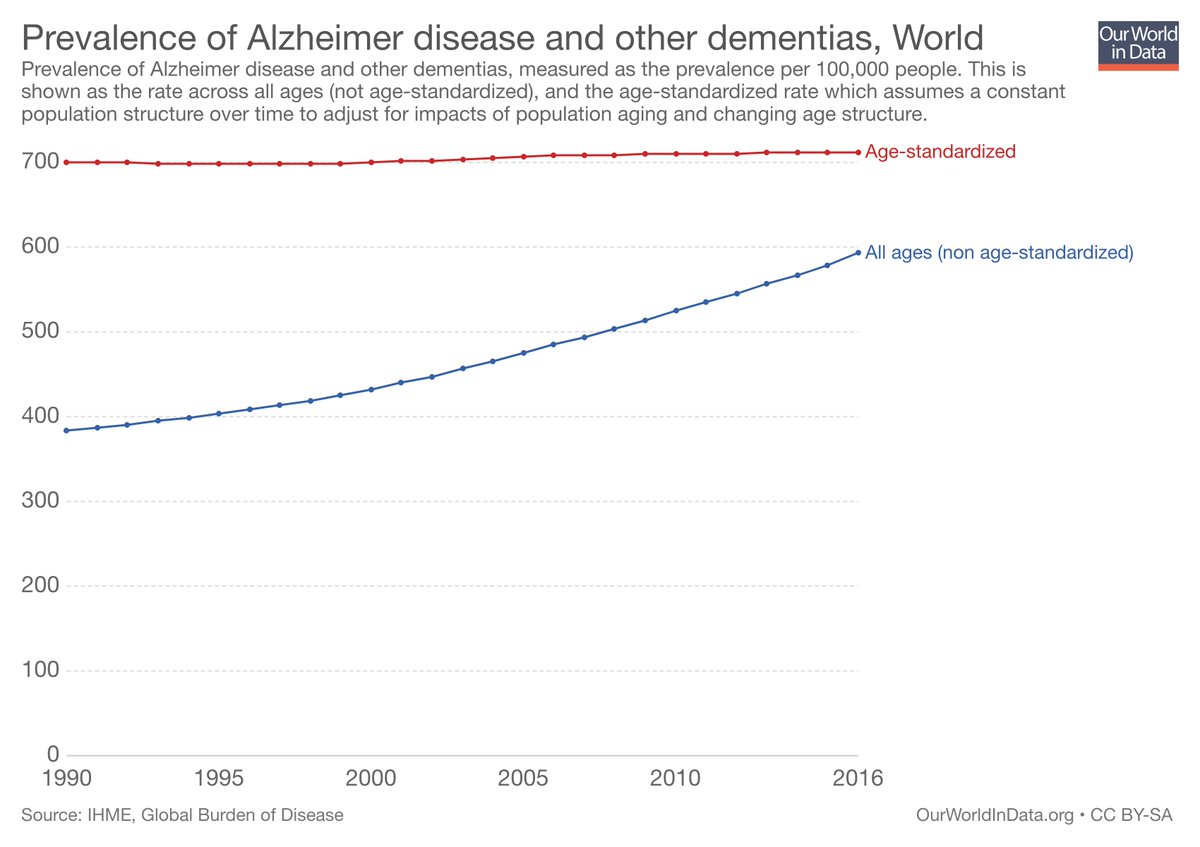 Is there a dementia epidemic? Definitely a major public health challenge, but largely result of long lives & aging populations Once corrected for aging, prevalence approx stable; in some cases falling. Explore for any country: https://ourworldindata.org/grapher/prevalence-of-dementias …pic.twitter.com/wtVfcBUn9v