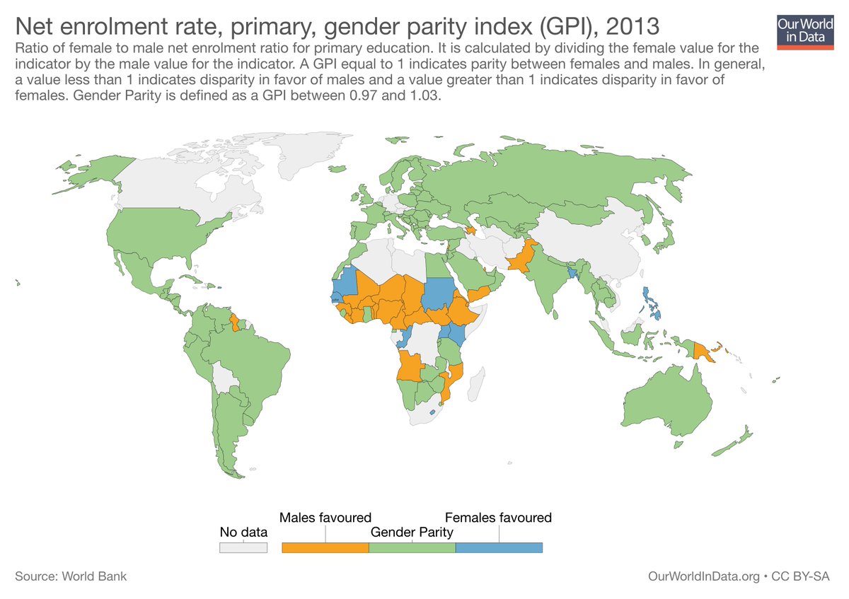 A few problems with this. 1. They can’t get data from Canada? 2. Nor China (Data OK for PISA)? 3. What does ‘parity’ actually mean here? All can attend? All get equal opportunity? Got to ask a few questions about some of the ‘green’ countries.