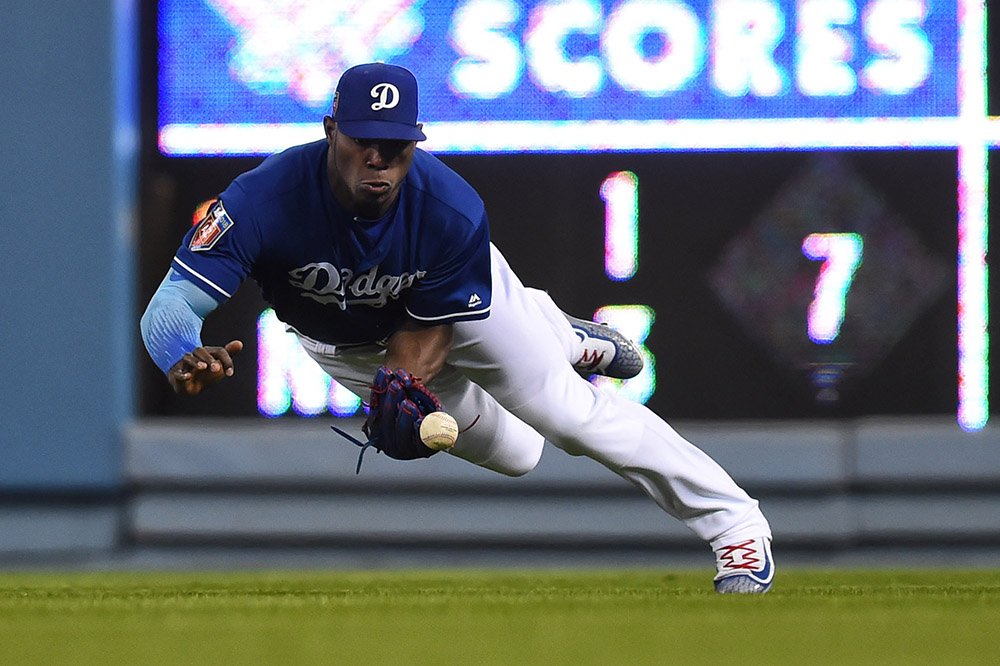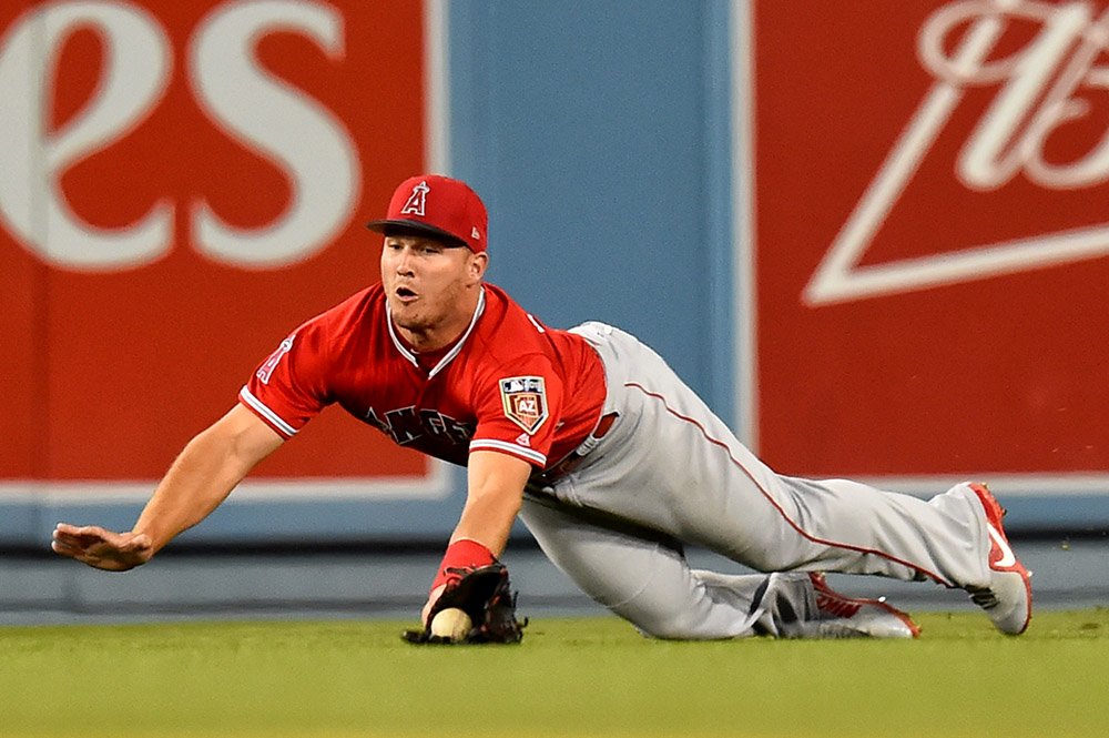 The Dodgers’ Yasiel Puig #66 dives for a fly ball during their game against the Angels.