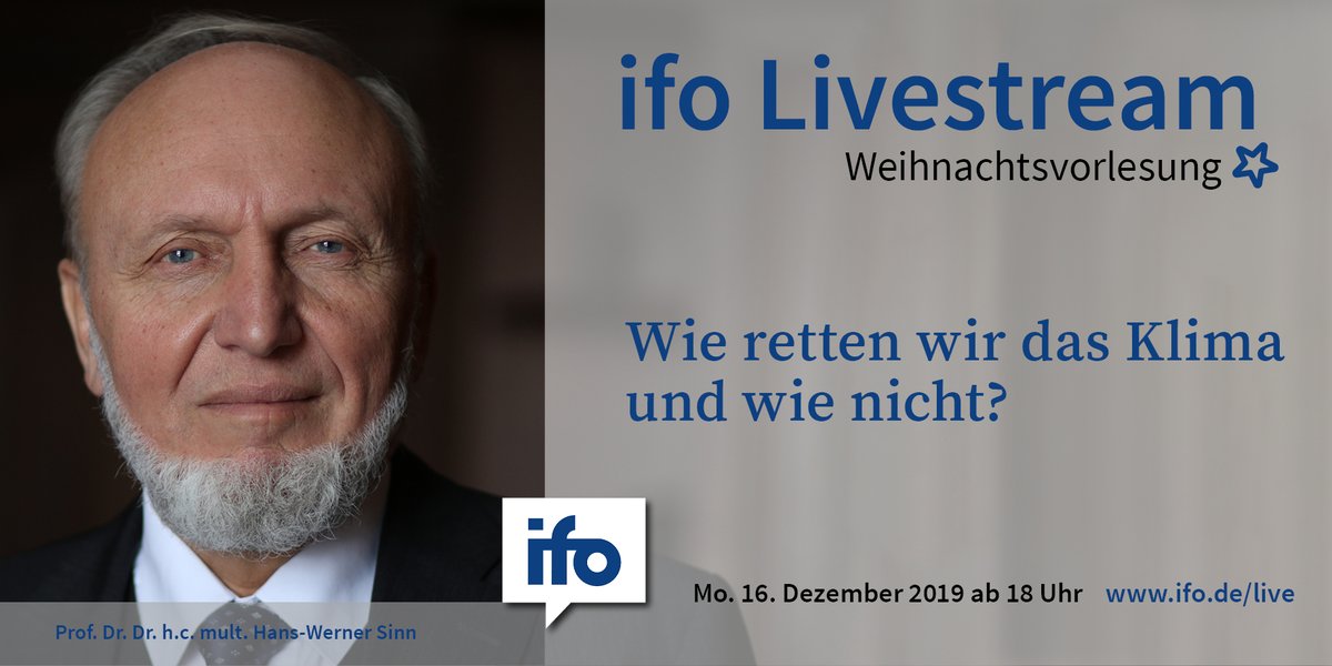 Meine Weihnachtsvorlesung zum Thema "Wie retten wir das Klima und wie nicht" findet am Montag, 16.12.2019, um 18h in der Großen Aula der LMU statt. Interessierte können sich anmelden unter https://www.ifo.de/node/49956 oder den Livestream verfolgen unter https://www.ifo.de/live .pic.twitter.com/RQmo9byacL