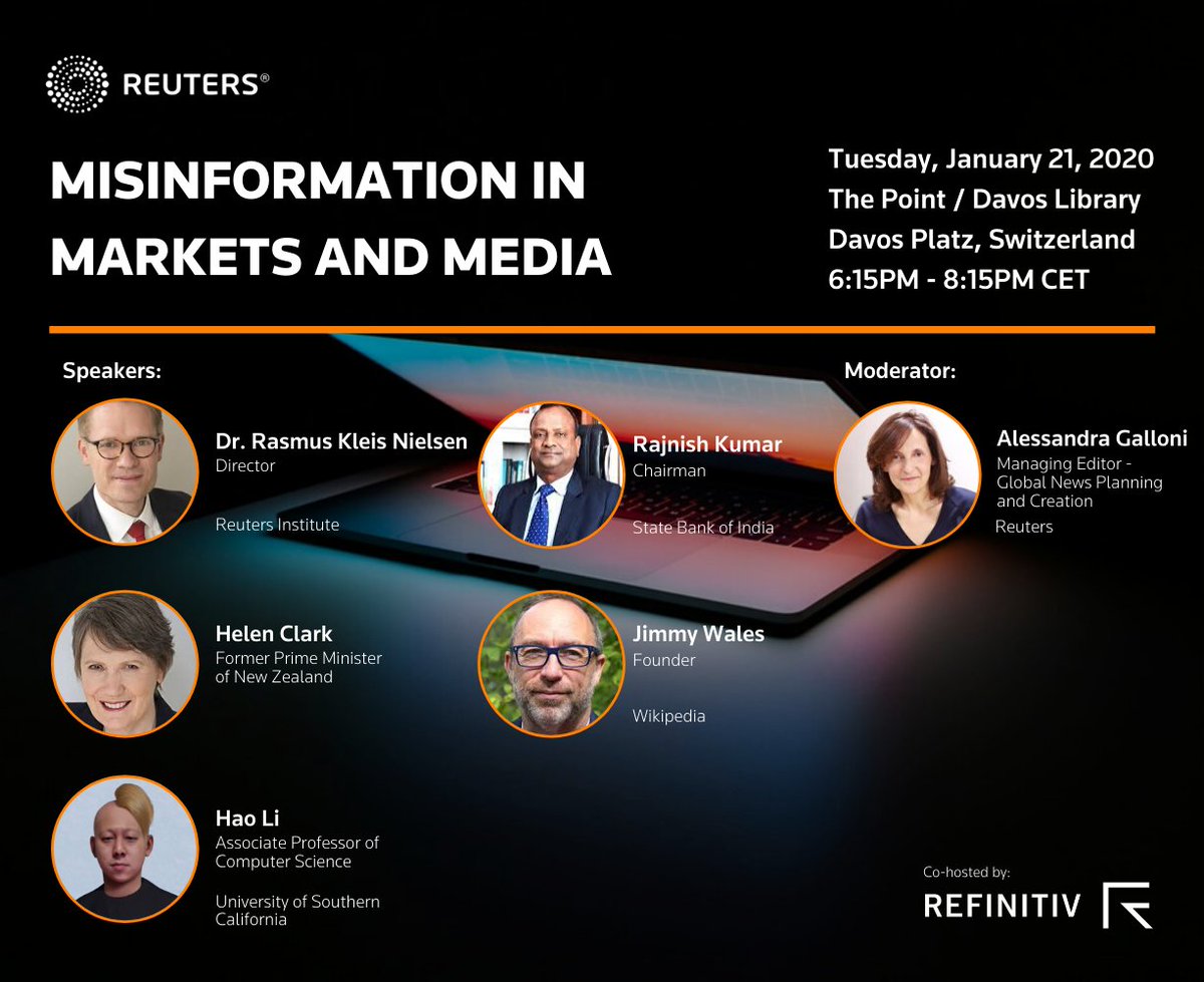 @wef:@Reuters Global Managing Editor@aagalloni is joined by@HaoLi81,@HelenClarkNZ,@jimmy_wales,@rasmus_kleis &@rkumar1958 to discuss misinformation in markets and media#wef20#davos2020 Watch it live here: http://bit.ly/2TKckI5 pic.twitter.com/GG2li8XI9B